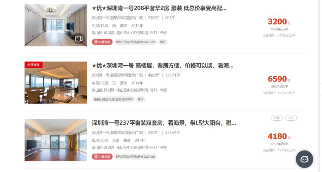 彼时2013年,深圳湾1号一期开盘,最低6万、最高17万的价格让市场大吃一惊。对于当时的深圳楼市而言,10万+的售价就是天价,这个项目捅破了深圳房价的天花板,成为了公认的深圳富人区。记者查询中原地产二手房信息,现在的深圳湾1号,二手房挂盘价基本在16万~19万元/平方米。而市场上,有地产中介人员告知,有些房价实达30万元/平方米以上。