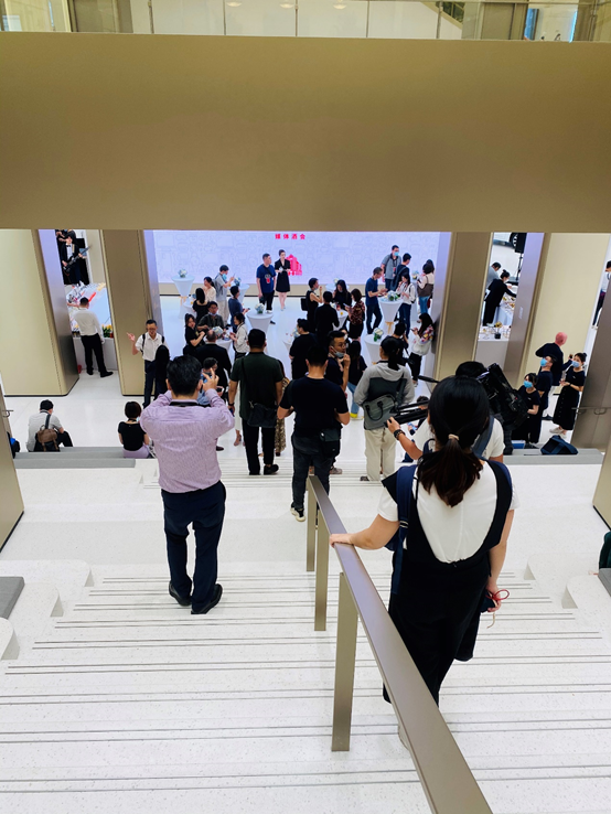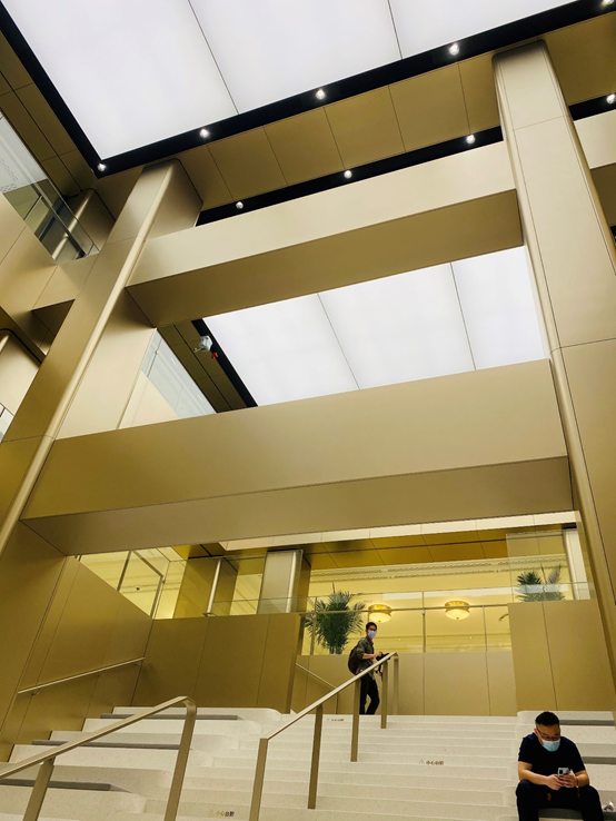 有意思的是,旗舰店内还设置了大量的公共空间,建筑本身的天井也以“中庭”的方式重新回归,宽大的步梯连接着各楼面,每位消费者都可以在这里拾级而坐,攀谈交流。