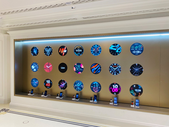 在旗舰店一楼产品体验区,除产品体验桌之外,墙面的壁柜按照消费者最常用的12个场景进行陈列,消费者可进行便捷的购物与场景体验;而在旗舰店二楼的全场景体验区,每个场景采用Art Deco风格的地面纹饰进行空间区隔,同时引入叠级设计,让空间更有层次感。该层体验区分为智能家居、移动办公、运动健康、智慧出行、影音娱乐等五大场景,消费者在这里可以体验到“一键切换居家模式”、“多屏协同”、“智慧步道”、“畅连”、“智慧出行”等。