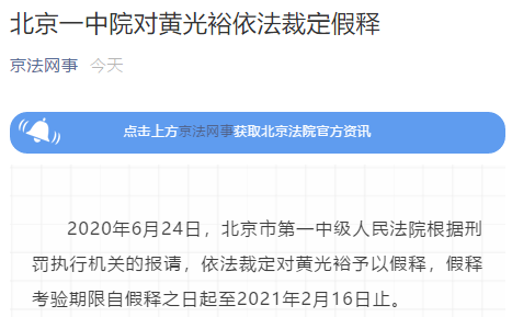 6月24日,北京市第一中级人民法院根据刑罚执行机关的报请,依法裁定对黄光裕予以假释,假释考验期限自假释之日起至2021年2月16日止。
