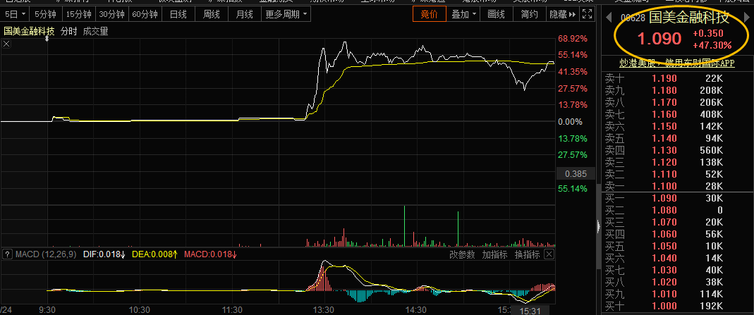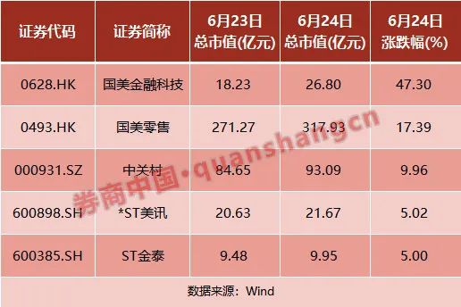 24日午后,有消息称黄光裕已于近日出狱,国美系股票突然异动。A股中关村、ST金泰和*ST美讯全线涨停,香港市场国美零售收盘暴涨17.39%,最多时涨幅超过24%;国美金融科技收盘狂飙47.3%,盘中最大涨幅一度超过58%。五大股票单日市值增长近65亿元人民币。