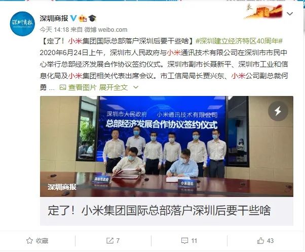 据深圳商报报道,小米集团国际总部落户深圳。2020年6月24日,深圳市人民政府与小米通讯技术有限公司在深圳市市民中心举行总部经济发展合作协议签约仪式。