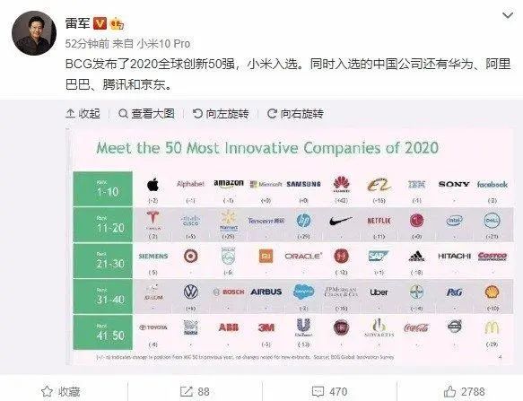 6月24日,小米集团董事局主席雷军发微表示,BCG发布了2020全球创新50强,小米入选。同时入选的中国公司还有华为、阿里巴巴、腾讯和京东。