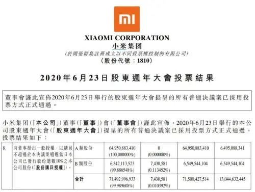 6月23日,小米在北京召开年度股东大会,股东针对董事重选、会计师事务所续聘等问题进行表决,随后晚间公司发布公告告知股东大会结果,其中股份回购授权议案已通过,授予董事会可以在适当的时候根据需要进行股份回购的权力,回购总数不超过议案通过日公司总股本的10%。