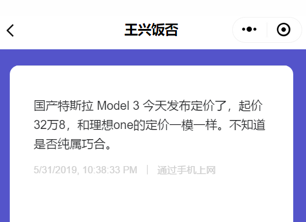 2019年5月30日,王兴第一次在饭否提及理想ONE,“国产特斯拉Model3今天发布定价了,起价32万8,和理想ONE的定价一模一样。不知道是否纯属巧合。”