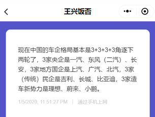 2020年1月5日,王兴写到:“现在中国的车企格局基本是3+3+3+3角逐两轮了,3家央企是一汽、东风(二汽)、长安;3家地方国企是上汽、广汽、北汽;3家(传统)是民企,吉利、长城、比亚迪;3家造车新势力,理想、蔚来、小鹏。”