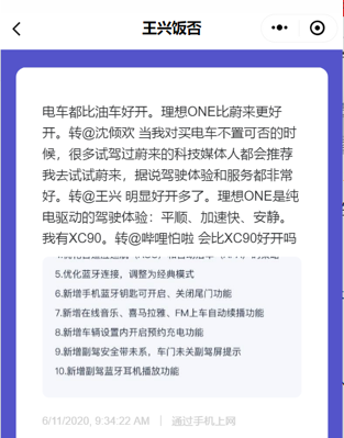随后的6月11日,王兴再次在饭否为理想ONE“站台”,直言:“电车都比油车好开,理想ONE比蔚来更好开。”