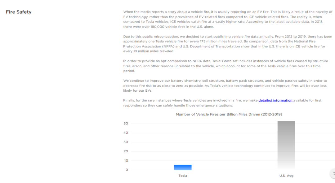 不过,根据特斯拉6月9日发布的《2019影响力报告》,特斯拉认为,媒体对电动汽车火灾的重点报道,给公众留下电动汽车火灾的刻板印象。数据显示,2012年到2019年,大约每行驶1.75亿英里会有一辆特斯拉汽车起火;而来自美国消防协会(NFPA)和美国运输部的数据则显示,在美国,冰上交通工具每行驶1900万英里就会起火。