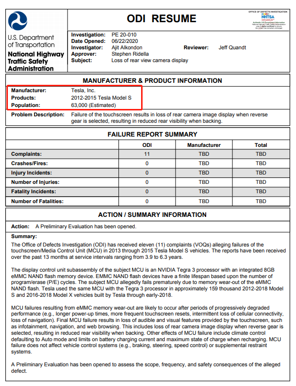 但值得注意的是,6月22日,美国国家公路交通安全管理局在文件中称,在过去13个月中共收到11起与Model S有关的投诉,目前正在调查2012年至2015年特斯拉Model S上出现的中央触摸屏失灵故障。