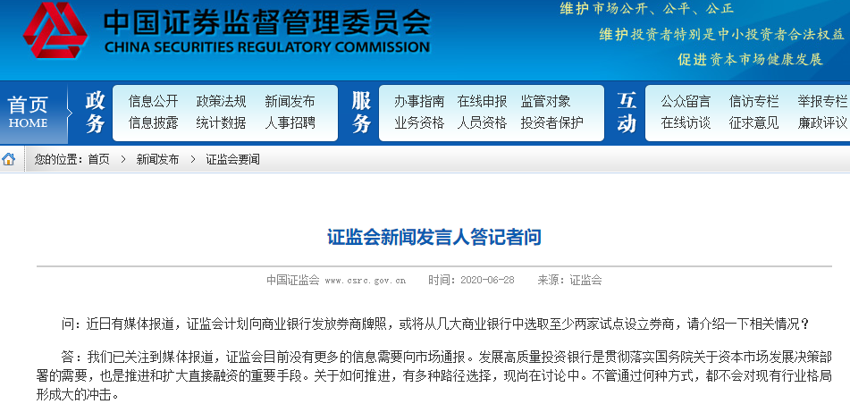 6月27日,《财新周刊》援引权威人士消息称,证监会计划向商业银行发放券商牌照,或将从几大商业银行中选取至少两家试点设立券商。