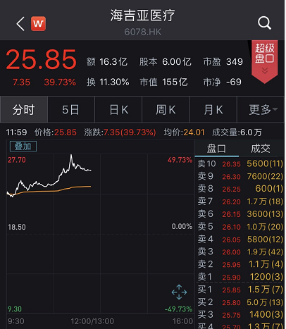 6月29日,海吉亚正式在香港联交所挂牌上市,股票代码为6078。发行价18.50港元,截止发稿前大涨近40%,股价为25.85港元,市值超155亿港元。