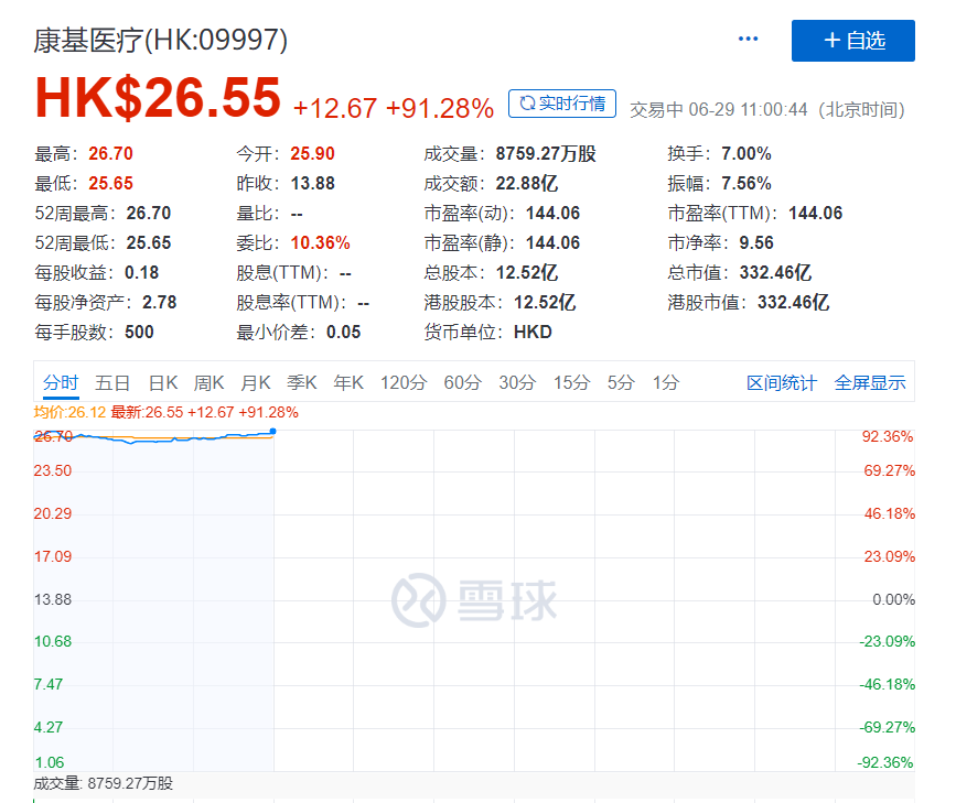 中国微创外科手术器械及配件(MISIA)平台康基医疗今日于港交所成功挂牌上市。盘中一度暴涨超90%,市值达331亿港元。公司发行2.25亿新股,募资超31亿港元,招股期间获超购逾305倍。
