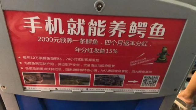 2017年到2018年期间,深圳鳄鱼宝科技有限公司(鳄鱼宝)在公交车上打出的广告。“手机就能养鳄鱼。2000元领养一条鳄鱼,4个月返本,年化收益15%”