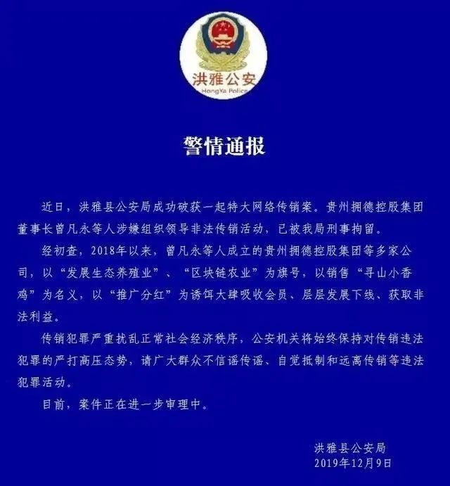 2019年12月9日,四川洪雅县公安局已经将贵州拥德控股集团董事长曾凡永等人刑事拘留。