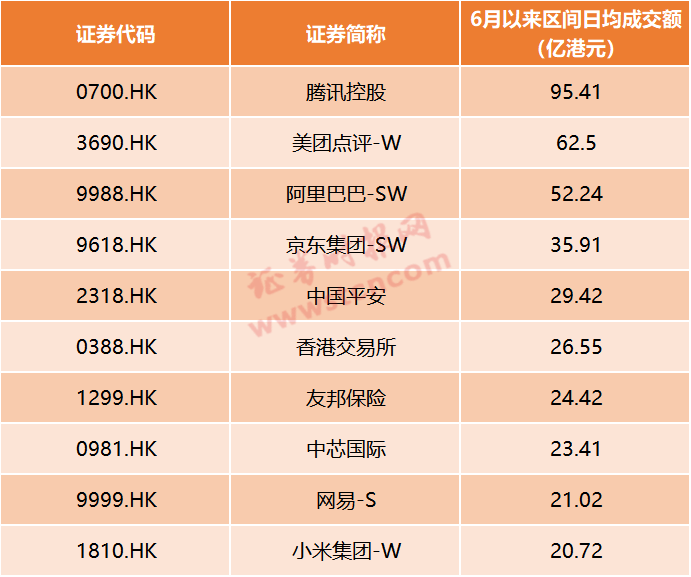 Wind数据显示,6月以来,以腾讯控股、美团点评、阿里巴巴、京东和中国平安为代表的内资股,成功占据了港交所成交额的前五名,日均成交额分别达95亿港元、62.5亿港元、52.24亿港元、35.9亿港元、29.4亿港元。这五大活跃股6月的日均成交额,占港股总成交额比重高达26%。除了中国平安以外,其余四家都属于内地互联网巨头。