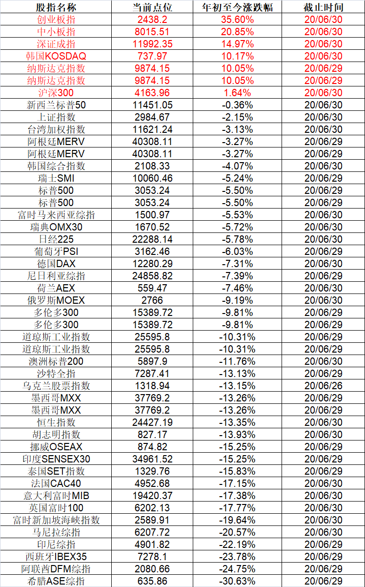 创业板指上半年跑赢全球主要股市