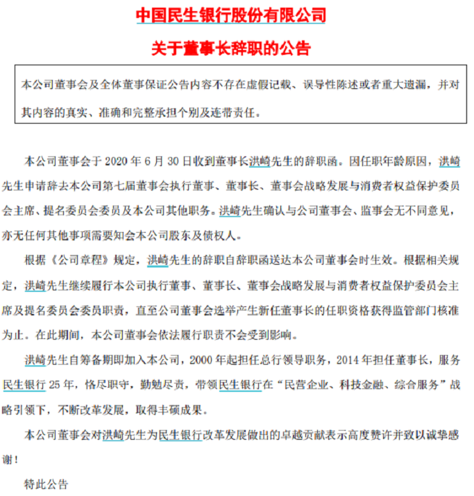 6月30日晚间民生银行公告称,因年龄原因,在民生银行工作长达25年的董事长洪崎申请辞去在该行的一切职务。