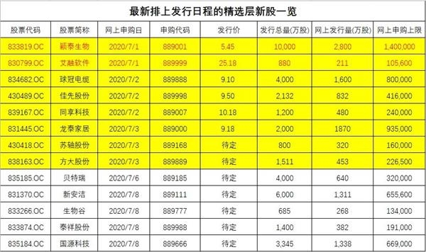 本周(7月1日-7月3日)精选层有8只新股发行,分别是7月1日的颖泰生物和艾融软件;7月2日还有同享科技、球冠电缆、佳先股份,以及7月3日龙泰家居、方大股份、苏轴股份发行。