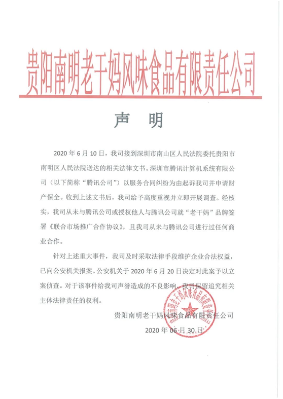 声明显示,2020年6月10日,老干妈接到深圳市南山区人民法院委托贵阳市南明区人民法院送达的相关法律文书。深圳市腾讯计算机系统有限公司以服务合同纠纷为由起诉老干妈并申请财产保全。