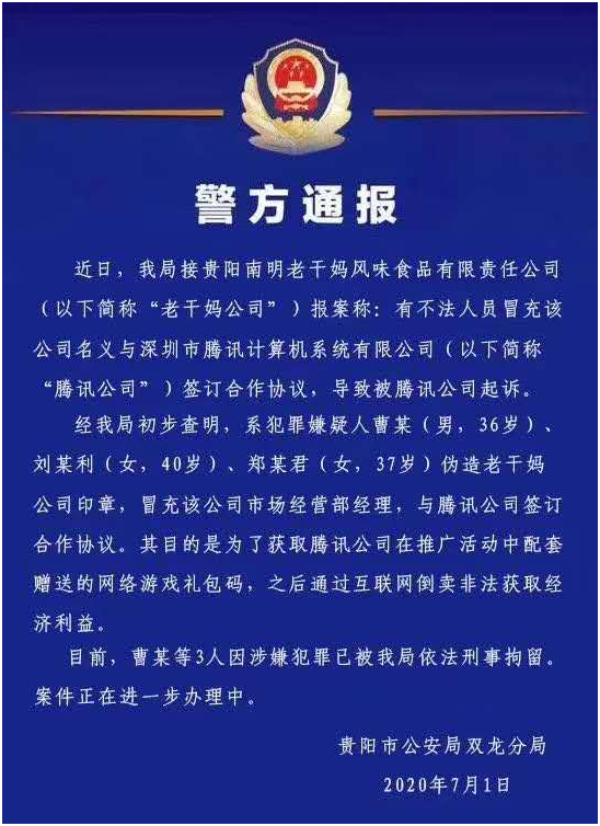 7月1日,贵阳市公安局双龙分局发布通报称,犯罪嫌疑人曹某、刘某利、郑某君3人伪造老干妈公司印章,冒充该公司市场经营部经理,与腾讯公司签订合作协议。其目的是为了获取腾讯公司在推广活动中配套赠送的网络游戏礼包码,之后通过互联网倒卖非法获取经济利益。目前,3人因涉嫌犯罪已被刑事拘留,案件正在进一步办理中。