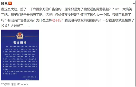 不过,也有网友表示疑惑,费这么大劲,签了一千六百多万的广告合约,竟然只是为了骗配送的网游礼包?法院裁决过程中为什么老干妈没提出是有人伪造啊?法院判决了事情闹大了才说是人家被骗,很诡异啊?