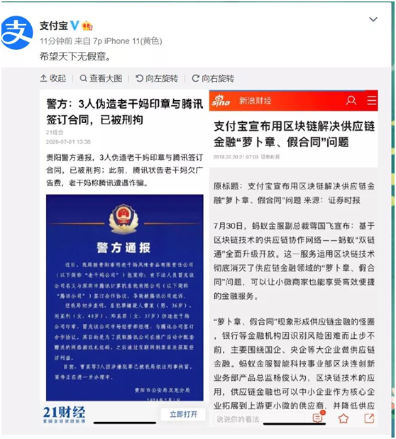 贵州警方声明出来之后,腾讯的老对手支付宝也跟着出来凑热闹:希望天下无假章。