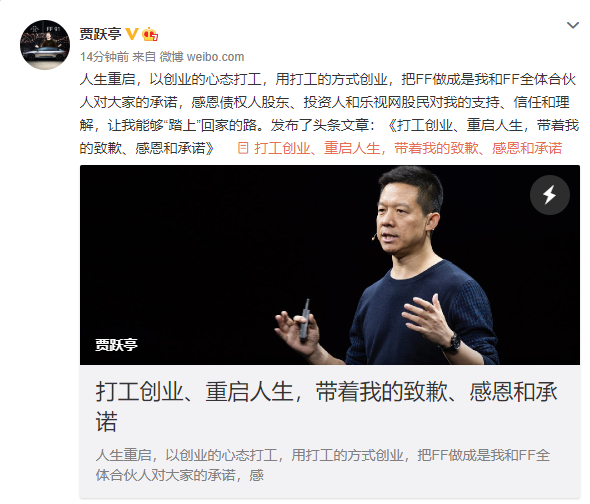 刚刚,贾跃亭在微博上发布标题为《打工创业、重启人生,带着我的致歉、感恩和承诺》的致歉信。