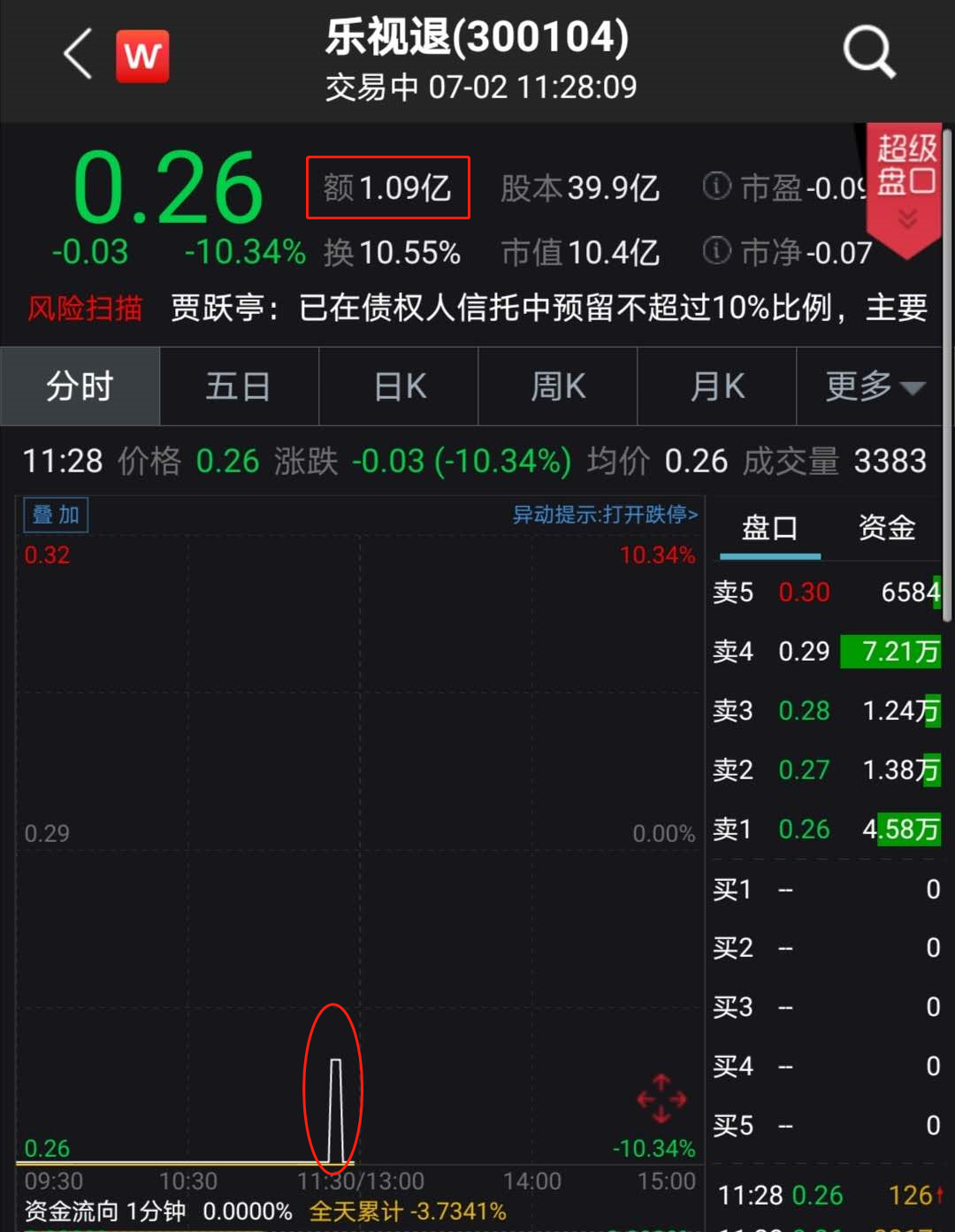 连续20多个跌停的乐视退,瞬间打开跌停,盘中跌幅一度收窄至4%以内。截止午间收盘,乐视退再度跌回跌停盘,成交额超1亿元。