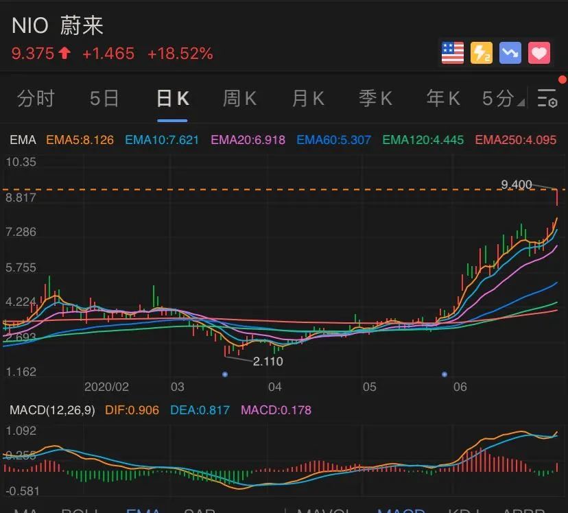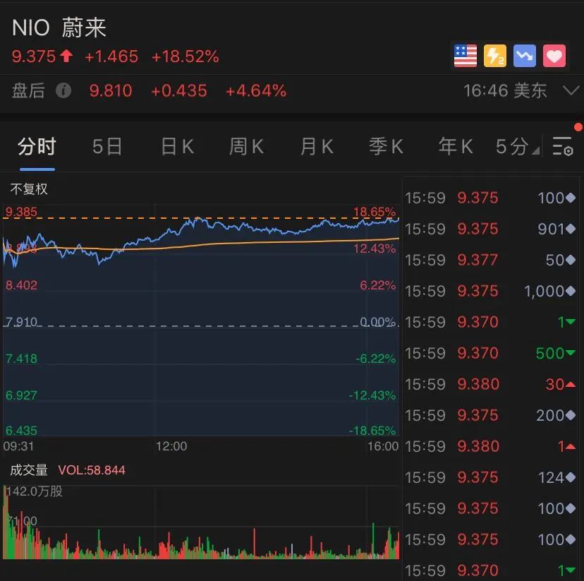 受此消息影响,蔚来大涨涨18.52%,市值达到111美金,约合人民币784亿。