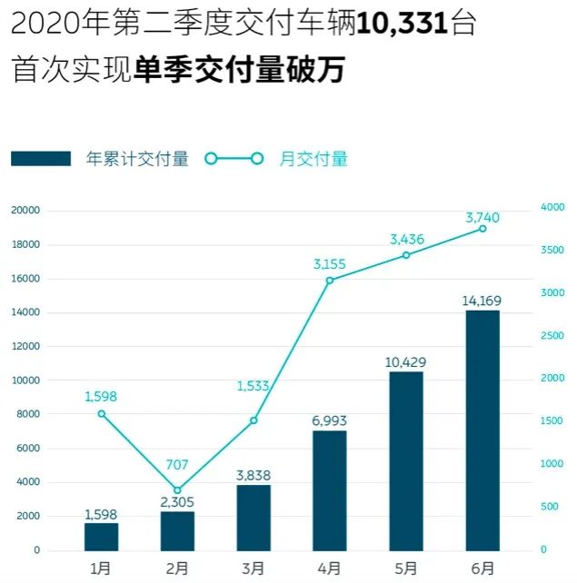 7月2日,蔚来公布2020年6月交付数据。今年6月,蔚来交付3740台汽车,继5月破纪录后再创月度新高。