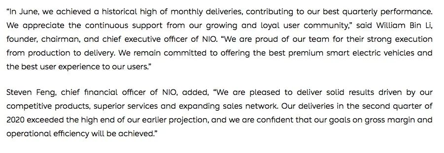 NIO首席财务官Steven Feng称:“我们很高兴在我们有竞争力的产品、优质的服务和不断扩大的销售网络推动下,实现了坚实的业绩。我们在2020年第二季度的交付量超过了我们先前预测的最高水平,我们有信心实现毛利率和运营效率的目标。”