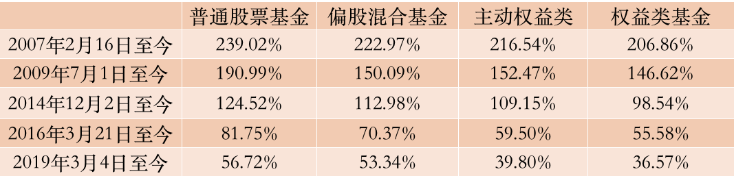 基金君筛选上攻到3000点的时候来看看走势,主要选择了2007年2月16日、2009年7月1日、2014年12月2日、2016年3月21日、2019年3月4日这五次上攻到3000点的重要时间点,而从这几次时间点到目前3000点,虽然看似上证指数为“0”,但偏股型基金均获得可观收益。