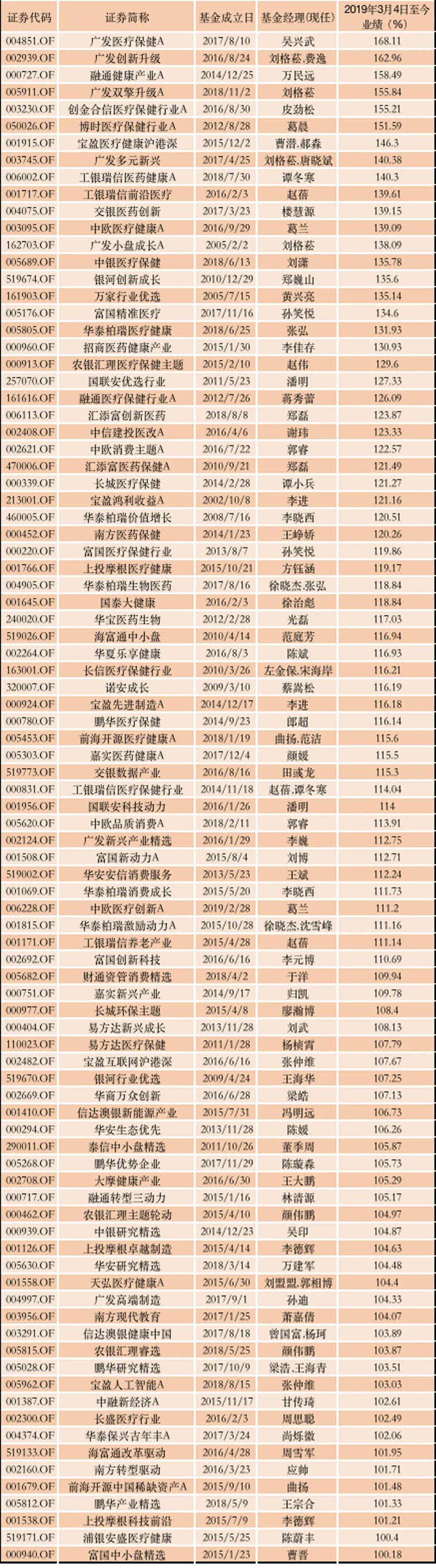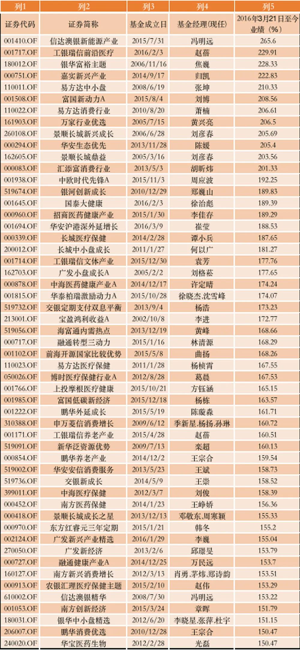 同样业绩较好的还有工银瑞信前沿医疗、银华富裕主题、嘉实新兴产业、易方达中小盘、富国新动力、易方达消费行业、万家行业优选、景顺长城新兴成长、华安生态优选等,收益也超过205%。