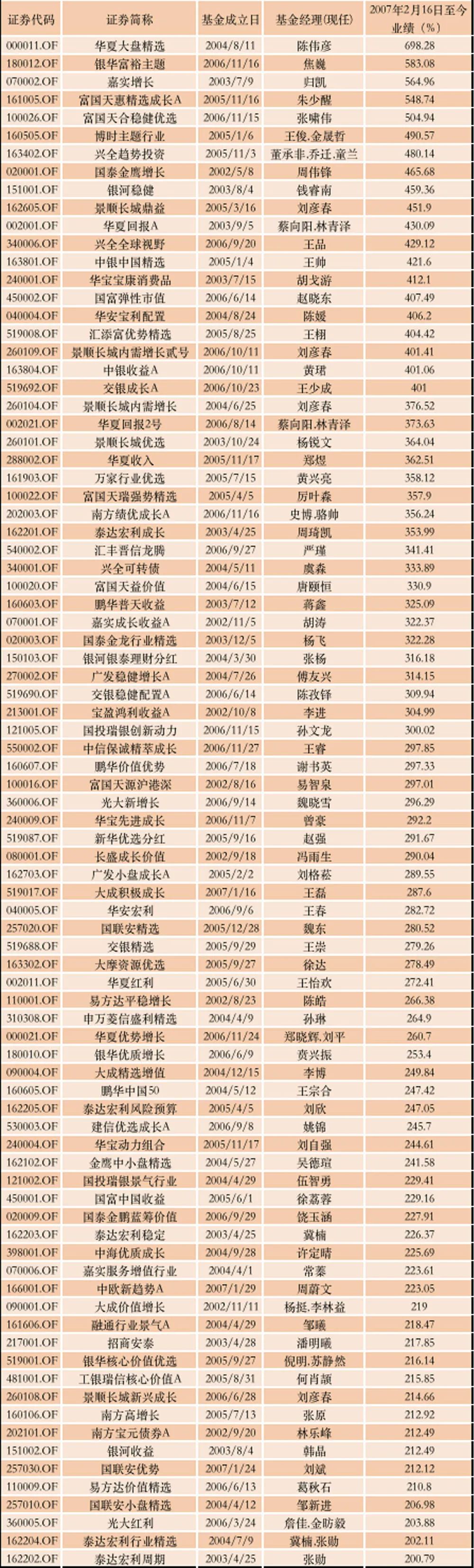 更令市场瞩目的是业绩最好的华夏大盘,这段时间的收益率高达698.28%,逼近700%,表现突出,基金一哥王亚伟也是当时打响名头。紧随其后的是银华富裕主题、嘉实增长、富国天惠精选成长、富国天合稳健优选收益,收益率也高达583.08%、564.96%、548.74%、504.94%、,同样表现出色,背后也凸显出朱少醒、周蔚文、邵健等一批优秀基金经理。