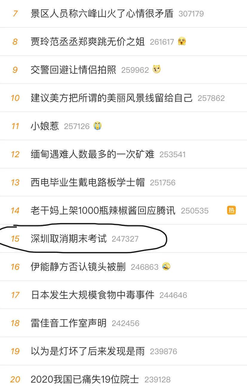 取消期末考试的消息,犹如一枚深水炸弹,引爆了大家的讨论热情,甚至冲上了微博热搜榜单。深圳本地的班级群、邻居群、兴趣班群等更是热烈讨论这个话题,连一些常年潜水的人也加入了讨论。