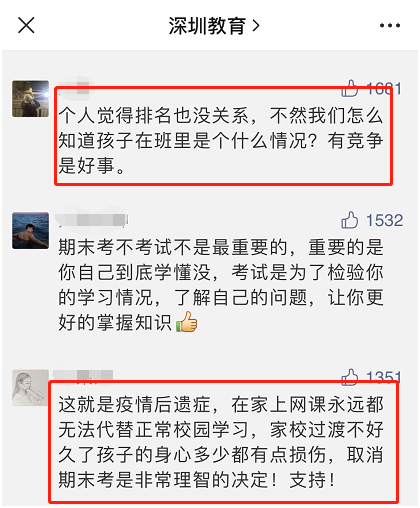 讨论分为旗帜鲜明的两派,“深圳教育”微信号下的两条高赞评论,分别代表了这两派的各自立场。