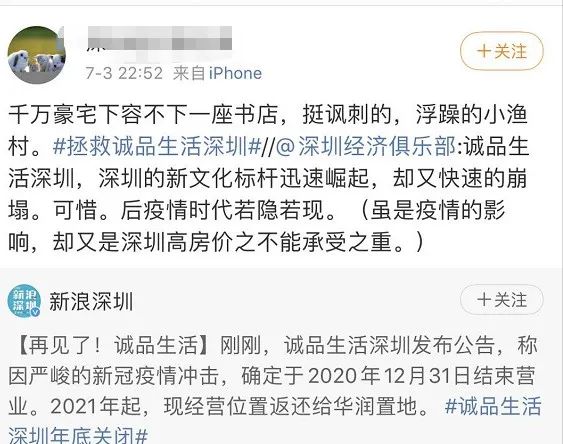 诚品生活坦言,突如其来的疫情,长久改变了世界及人们的生活方式,周边化境之挑战,亦对短中期稳健经营形成冲击,促使诚品生活深圳必须改变运营计划,以健全公司整体中长期的经营体质。在与业主华润置地多方探讨后,虽然怅然不舍,只得暂别。