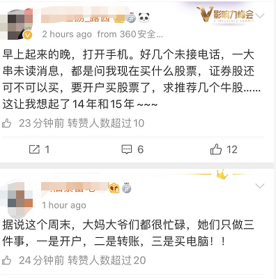 “据说这个周末,大妈大爷们都很忙碌,她们只做三件事,一是开户,二是转账,三是买电脑!!”