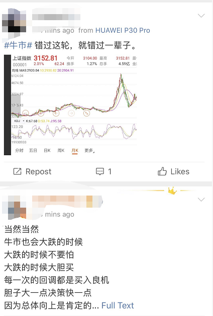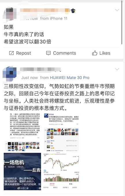 各大社交平台都是满屏的“牛市”。有人直言牛市来了,感觉周末都是多余的,甚至有人表示已经开始卖房炒股,全民陷入“牛来了”的热情中。