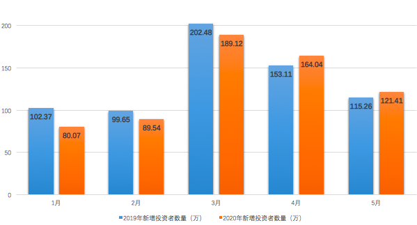 3、4、5月新增投资者近500万人。其中4、5两个月新增投资者均超过去年同期水平。中国结算数据显示,2020年5月份新增投资者数量为121.41万,相比去年5月份的115.26万,同比增长5.34%;2020年4月份新增投资者数量为164.04万,相比去年4月份的153.11万,同比增长7.14%。