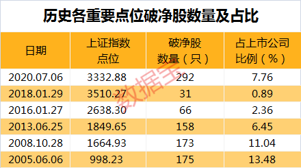 证券时报•数据宝统计显示,截至7月6日收盘,沪深两市破净股数量为292只,纵观以往几次重要历史底部,最近的一次沪指2638点时破净股数量有66只,沪指1664点时破净股有173只,而沪指5178点高位和6124点高位时已不存在破净股。