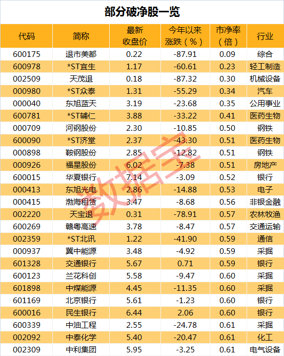 以最新收盘价进行统计,目前A股市场上共有292只股股价跌破净资产,即通常所说的市净率小于1,占A股公司的比例达7.76%。具体来看,市净率最低的是退市美都,最新收盘价为0.22元,市净率0.09倍;其次是*ST宜生,最新收盘价1.17元,市净率0.23倍;天茂退最新收盘价0.18元,市净率0.3倍,位居第三。