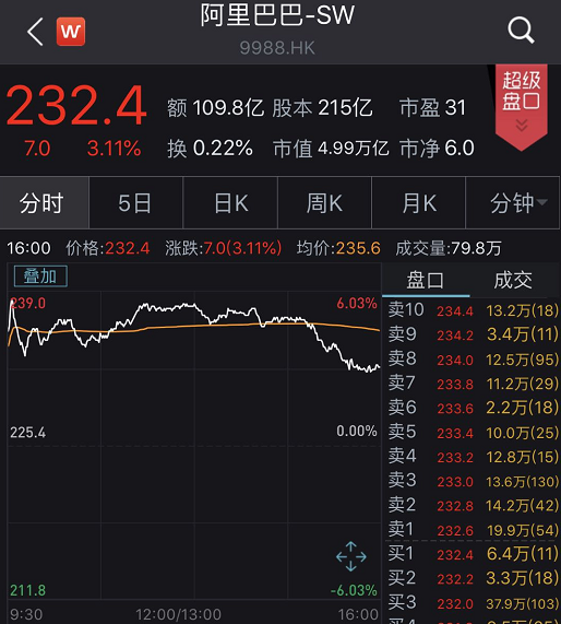 今日早盘,阿里巴巴港股高开5.68%,盘中一度高至239.0港元/股,随后涨幅虽有所收窄,但截至收盘,仍有3.11%涨幅,报232.4港元/股,最新总市值为4.99亿港元,较昨日大涨约1500亿港元。