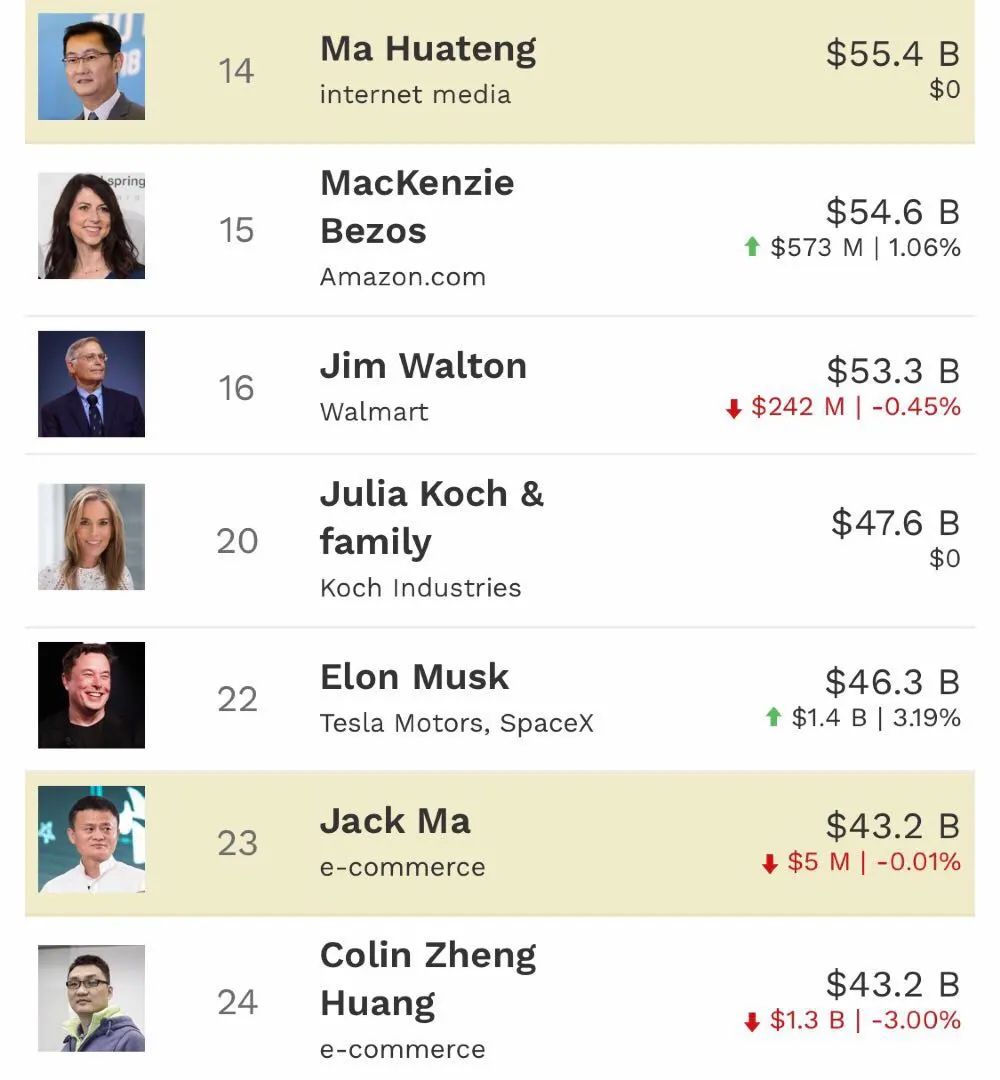 福布斯实时富豪榜的最新统计显示,马化腾身家554亿美金,约合3884亿人民币,位列全球第14大富豪;而马云则身家432亿美金,约合3028亿人民币,居于马斯克之下和黄铮至上,位列全球第23大富豪。
