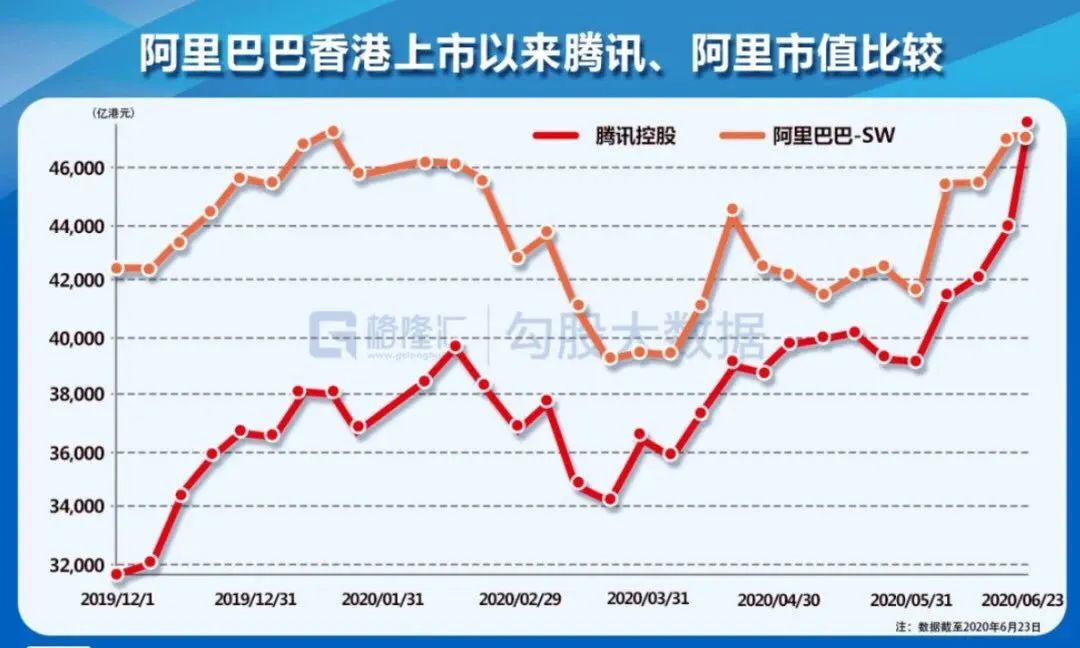 若以2019年11月26日收盘作为起始计算,截至6月23日收盘,腾讯股价从350港元左右上升至497.4港元,涨幅高达近50%;而阿里则从187.6港元涨至220港元,涨幅为17%。从市值来看,半年多时间,腾讯市值暴涨约1.4万亿港元,是阿里市值增长的两倍。