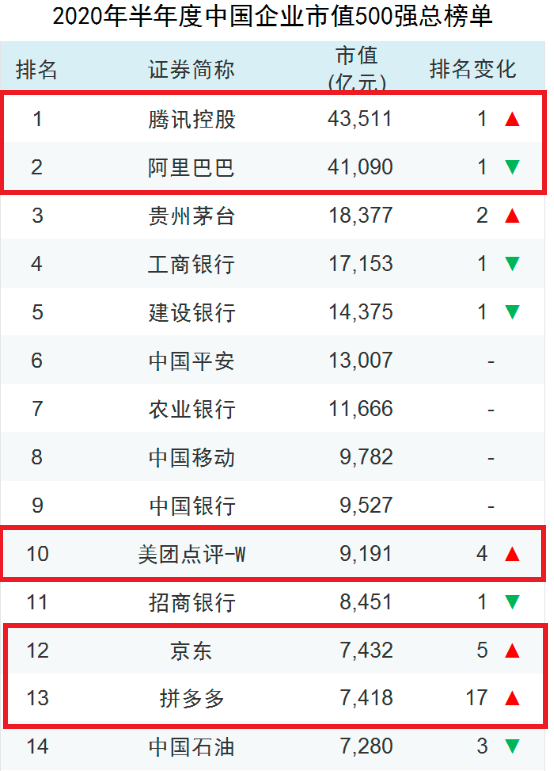 Wind最新发布2020年半年度“中国上市企业市值500强”榜单中,目前国内已上市的前五大互联网公司,美团、拼多多和京东都是腾讯的“友军”。腾讯分别持有美团、京东和拼多多超15%的股份,同时还拥有斗鱼、虎牙和BILIBILI在内的多家国内热门互联网公司股份。