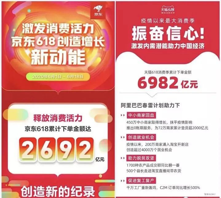 今年618,主流电商平台只有京东和天猫在战报公布了成交金额,两家双双破记录,其中京东18天的累计下单金额为2692亿元,天猫更是以6982亿元的成绩力压京东2.6倍。同时,618期间,淘宝中小型商家的订单量,相较于去年同期增长了整整10亿。
