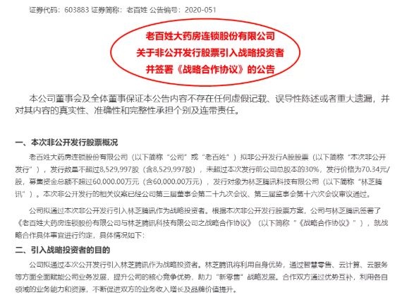 6月22日,国内规模领先的药品零售连锁企业之一的老百姓发布公告,表示拟向腾讯系企业林芝腾讯发行不超853万股,发行价为70.34元,募资不超6亿元;同时拟通过本次非公开发行引入林芝腾讯作为战略投资者,并签署战略合作协议。