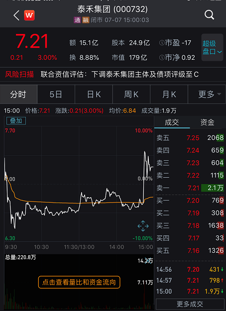 截至今日收盘,泰禾集团股价7.21,上涨3%,盘中一度下跌近8%。此前,泰禾集团收获连续三天涨停。