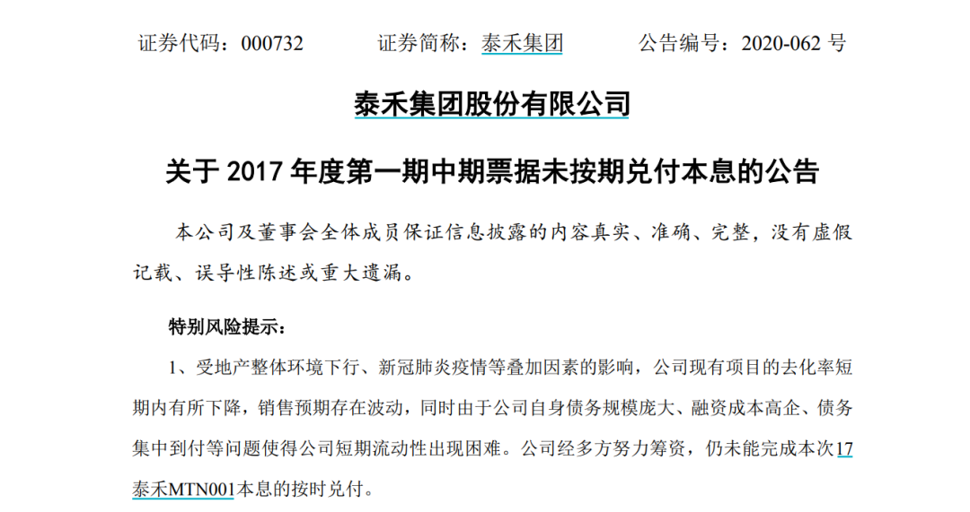7月6日晚间,泰禾集团发布《关于2017年度第一期中期票据未按期兑付本息的公告》表示,受地产整体环境下行、新冠肺炎疫情等叠加因素的影响,公司现有项目的去化率短期内有所下降,销售预期存在波动,同时由于公司自身债务规模庞大、融资成本高企、债务集中到付等问题使得公司短期流动性出现困难。公司经多方努力筹资,仍未能完成本次17泰禾MTN001本息的按时兑付。